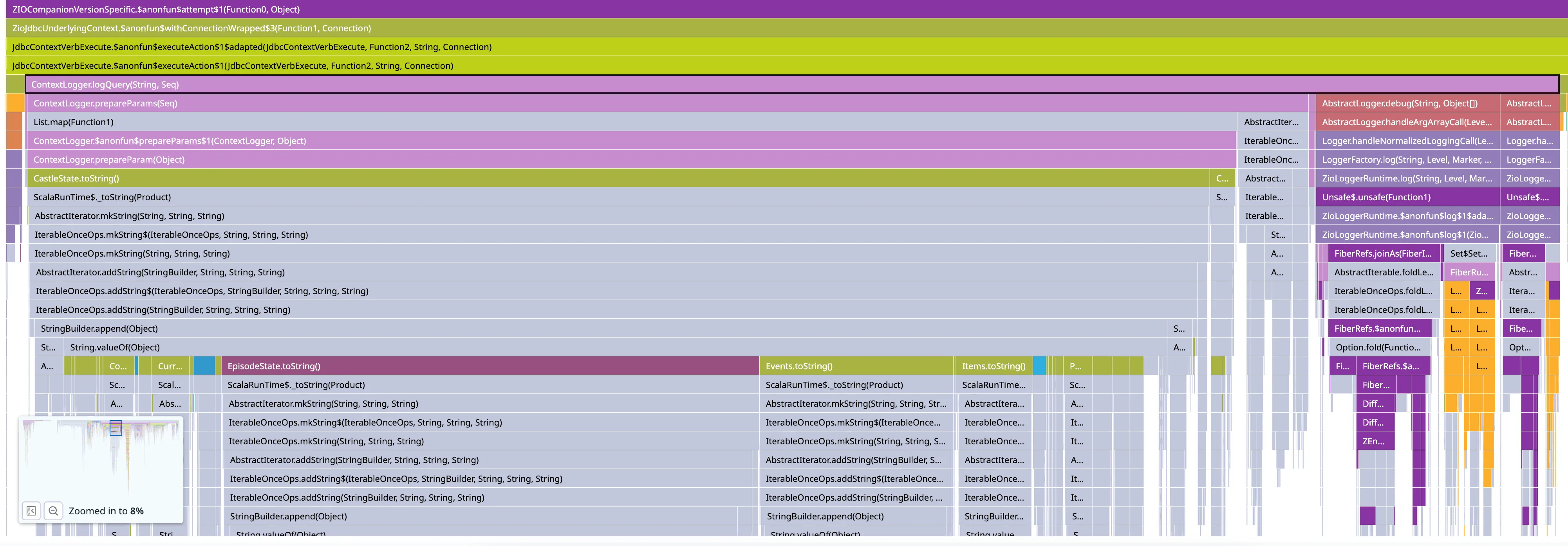 It is spending a lot of time in a function called CastleState.toString(). CastleState is a pretty large domain object that gets written to the database quite often, so it makes sense that computing its toString would be pretty slow. However, there is no call to toString in our code at all. What’s happening then?