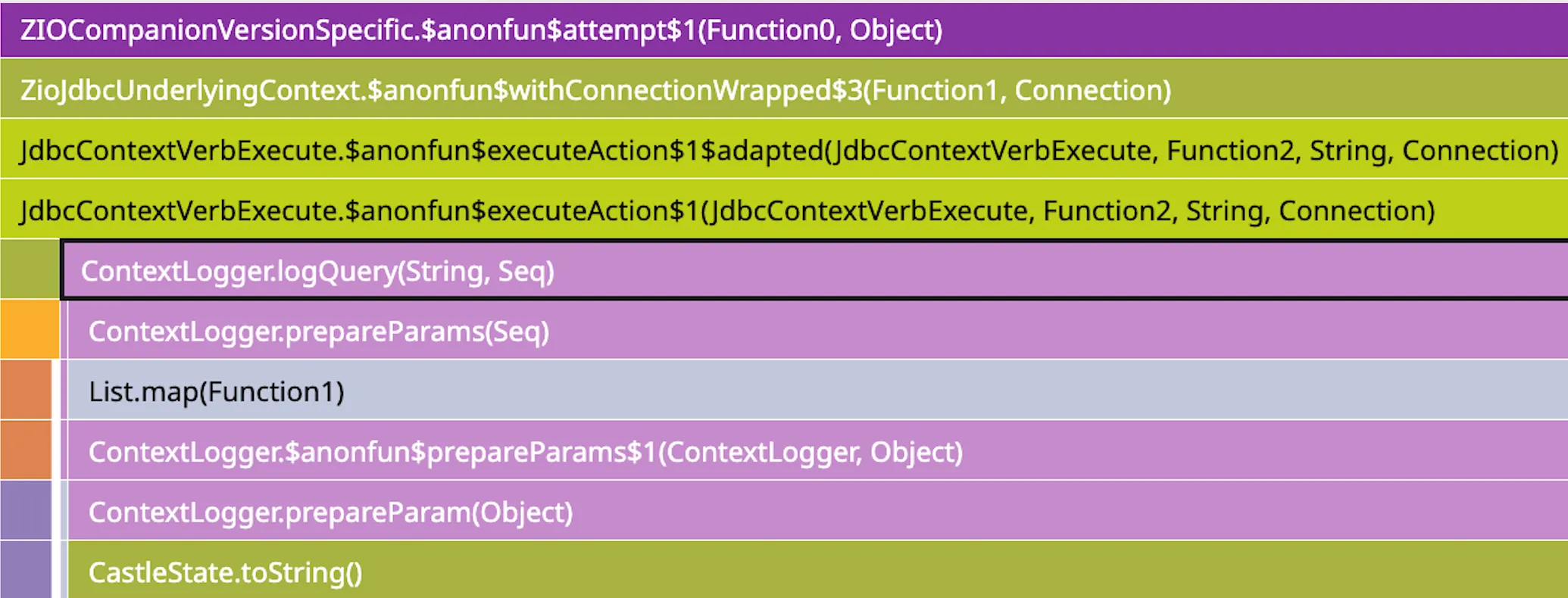 The call originates from ContextLogger.logQuery, which belongs to the Quill library that we use for all database access. Let’s examine the logQuery function in detail (here’s the code on GitHub):
