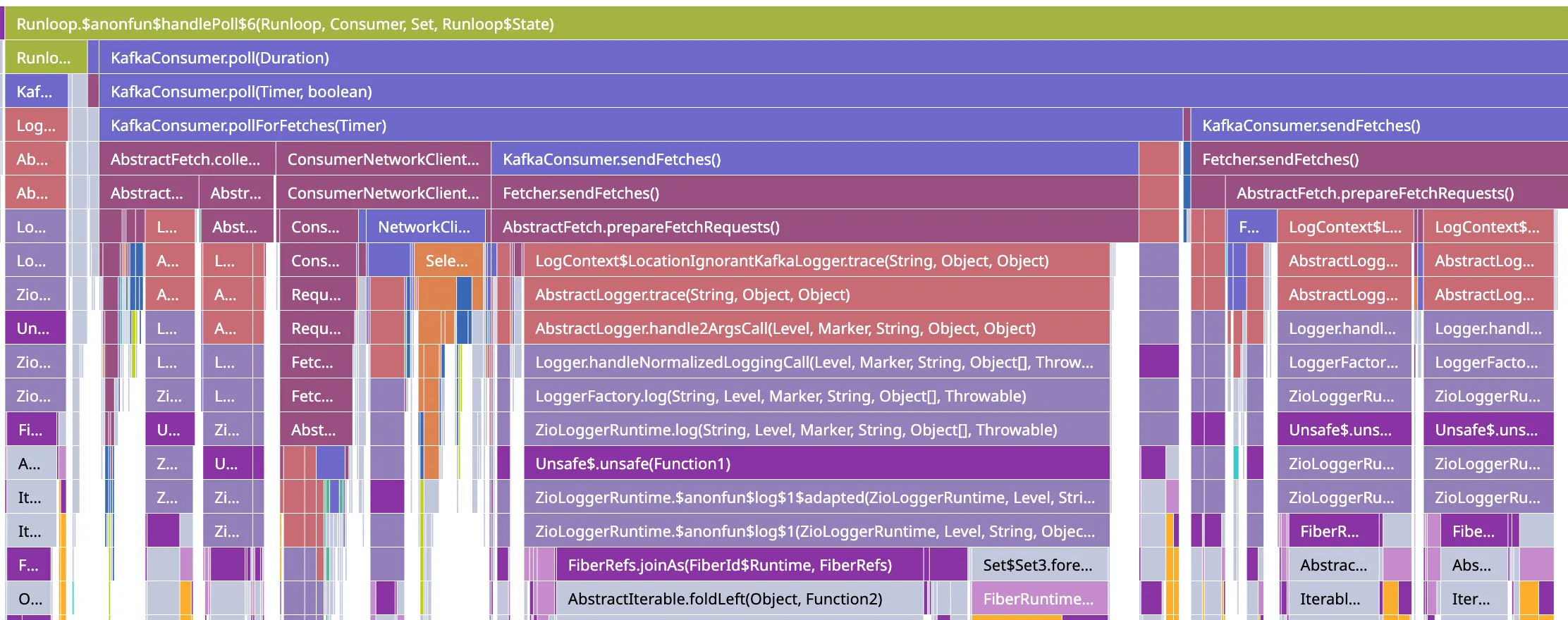 As you can see, most of the CPU used inside the Kafka poll function is actually spent logging, particularly in ZIOLoggerRuntime, which is the code that tries to recover the current fiber context. Because Kafka is very verbose at trace and debug levels, and because the bridge forwards ALL logs to ZIO.log and lets the ZIO logger do the filtering, we end up with a situation like this.