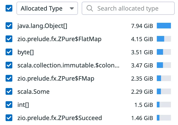 This overhead is sometimes dismissed as merely anecdotal. It might be in some cases, but I work on game servers where domain logic is complex enough that 63% of all allocations come from it. When I profiled our server, ZPure showed up as responsible for a large chunk of those allocations: