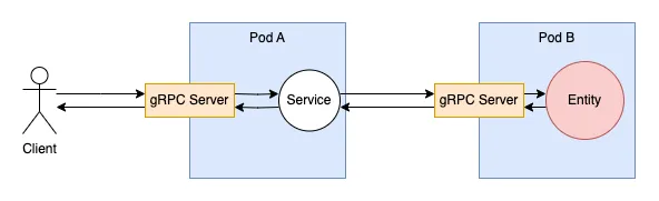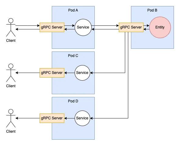 Client requests hit a first pod’s gRPC server, then each request is dispatched to a service that eventually calls the send method we just saw. That triggers a call to another pod (unless we’re lucky and the entity is hosted by the same pod), also using gRPC. The second pod’s gRPC server forwards the message to the local entity, and the entity’s reply is sent back as a response to the gRPC call. The service can then process this response and return a response to the client.