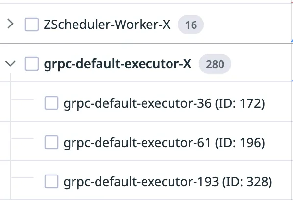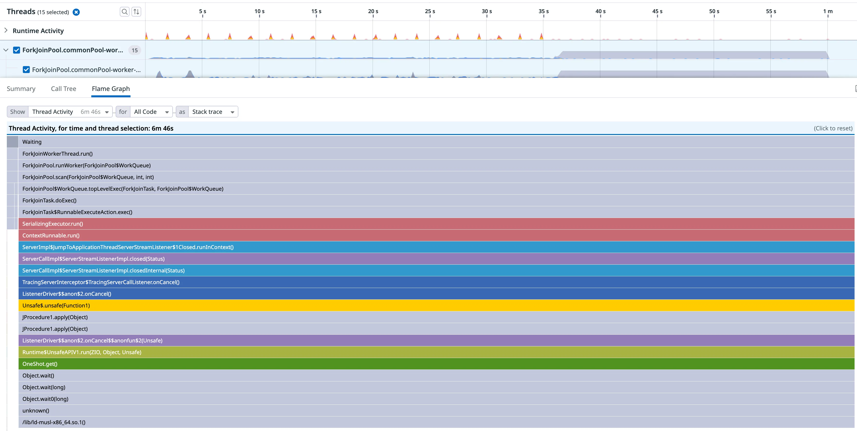 Fortunately, the Datadog profiler was able to capture one last profile before the servers were killed. It showed that all threads from our grpc executor threadpool were waiting on the same lock.