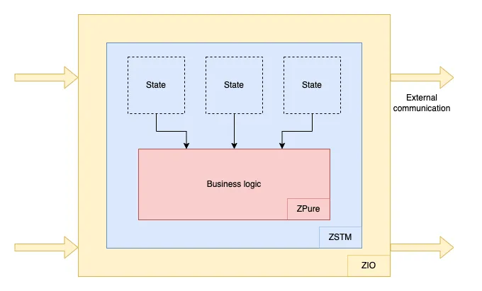 Running a ZSTM transaction returns a ZIO: we’re now in the outermost layer! Here, we’re allowed to run side effects. Ideally, the business logic in this part of the code should be reduced to a minimum, and we should be doing side effects only.